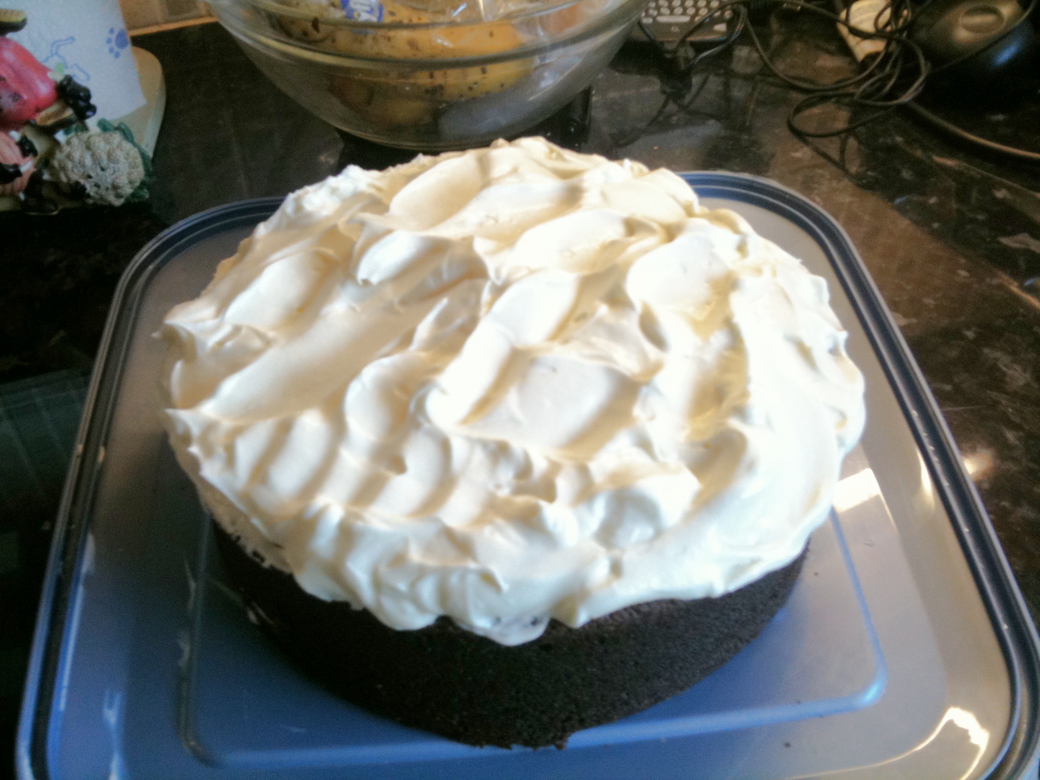 To make the icing cream the cheese, icing sugar and cream together, you make need to add a little more icing sugar if its still very runny, and then liberally spread all over the cake with a palate knife.